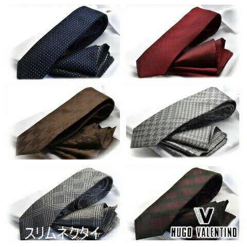 ブランド ネクタイ (6.5cm幅) HUGO VALENTINO/ tis-h-21set スリムネクタイ & ポケットチーフ 2点SET 高品質 ネクタイ シルク Silk Necktie